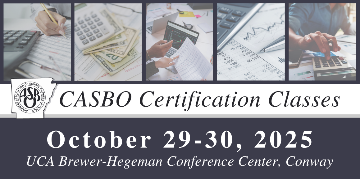 The Arkansas Association of School Business Officials (AASBO) has scheduled six sessions of certification classes for October 29-30, 2025 at the Brewer-Hegeman Conference Center on the Campus of UCA in Conway. These classes will provide three of the required courses for CASBO Certification and three electives as required for recertification. 💻 Joining by Zoom? We’re glad to offer both onsite and virtual options for these classes! If you plan to attend by Zoom, please remember: You’ll need to be logged in for at least 100 minutes (anything less—even 99 minutes—won’t count).